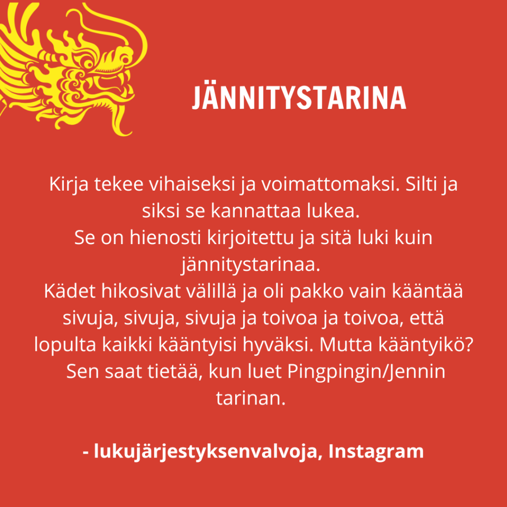 Se on hienosti kirjoitettu ja sitä luki kuin jännitystarinaa. Kädet hikosivat välillä ja oli pakko vain kääntää sivuja, sivuja, sivuja ja toivoa ja toivoa, että lopulta kaikki kääntyisi hyväksi. Mutta kääntyikö? Sen saat tietää, kun luet Pingpingin/Jennin tarinan. ”