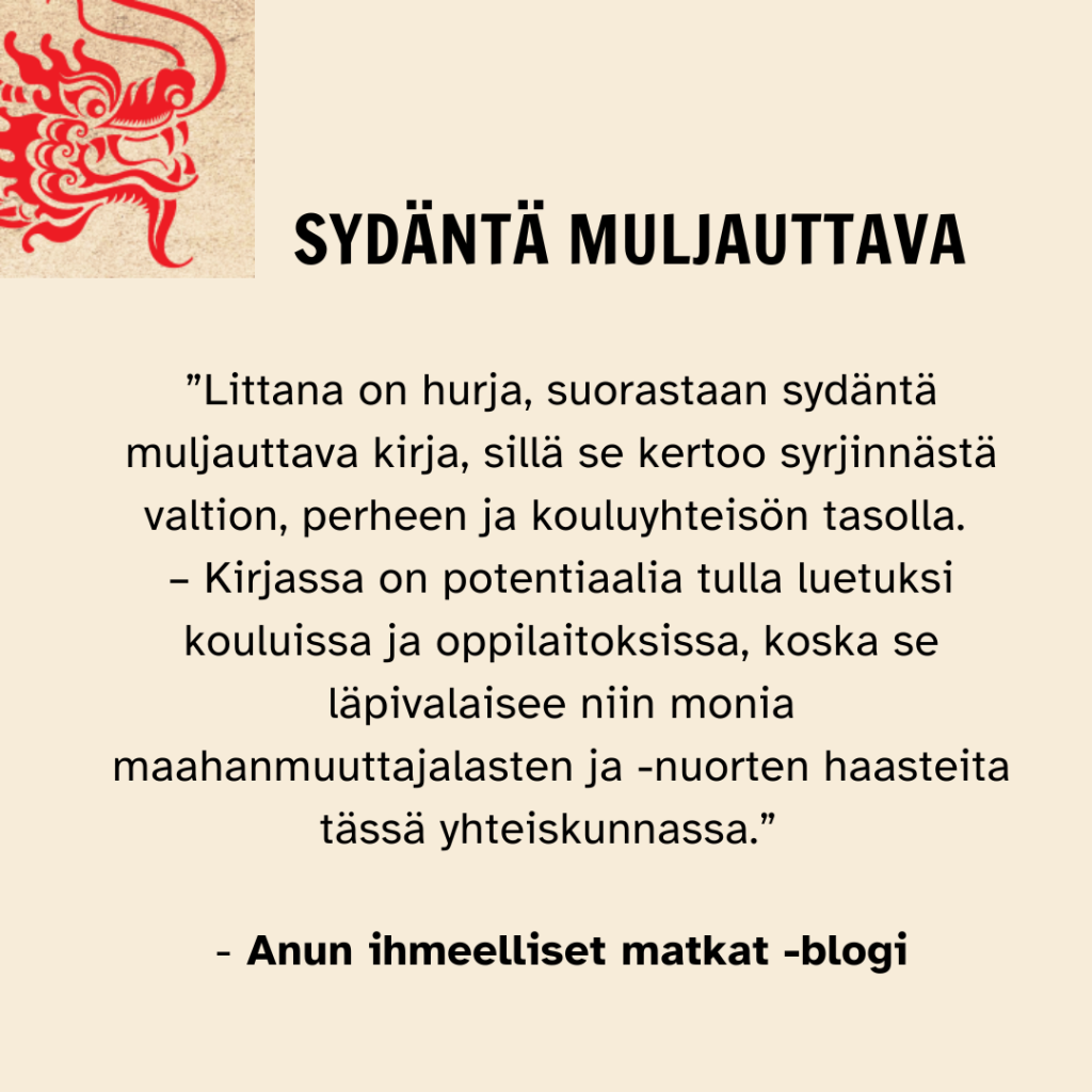 Littana on hurja, suorastaan sydäntä muljauttava kirja, sillä se kertoo syrjinnästä valtion, perheen ja kouluyhteisön tasolla. Ehkä julminta kohtelua Pingping kuitenkin kokee äitinsä ja siskonsa taholta, koska perheen jäsenten kuuluisi edes jotenkin olla toistensa puolella. Pingpingin perheessä isosisko on prinsessa, jolla on valtavasti etuoikeuksia suhteessa pikkusiskoon. Hänen äidillään ei riitä empatiaa nuorempaa tytärtään kohtaan, koska tämän syntymä väärän sukupuolen edustajana on ollut niin suuri pettymys.